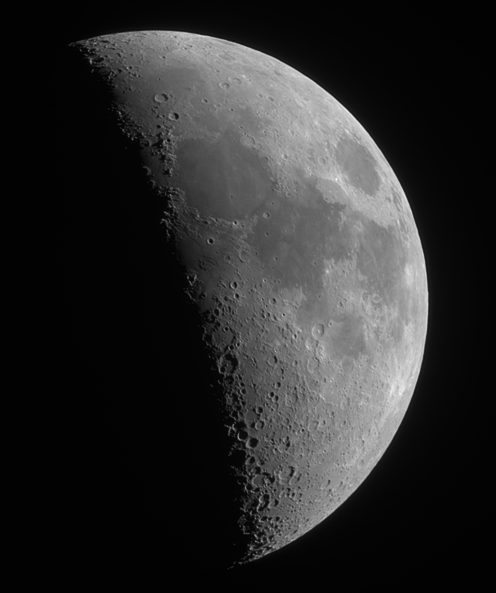 Image 2: The Lunar X & V stand out in high relief on the disk of the moon on October 28, 2025 at 7:24pm local time or 23h 24m UT. The moon was at 43% phase and only 37 degrees above the horizon. Weather conditions included clear skies with good steady seeing. Image was taken with an altazimuth driven Meade LX200GPS ACF 8-inch GO-TO Schmidt-Cassegrain telescope utilizing an Optec 0.62X focal reducer. A ZWO ASI 178MM monochrome camera with an Optolong UV-IR cut filter using Firecapture v2.7.14 to acquire the video. Computer utilized was an MSI GF65 gaming computer upgraded to 40GB of RAM. The SER video was processed using Autostakkert 4.0.13 and Registax 6.1. Further sharpening and processing in Photoshop CS4. Image by Gregory T. Shanos Longboat Key, (Sarasota), Florida.