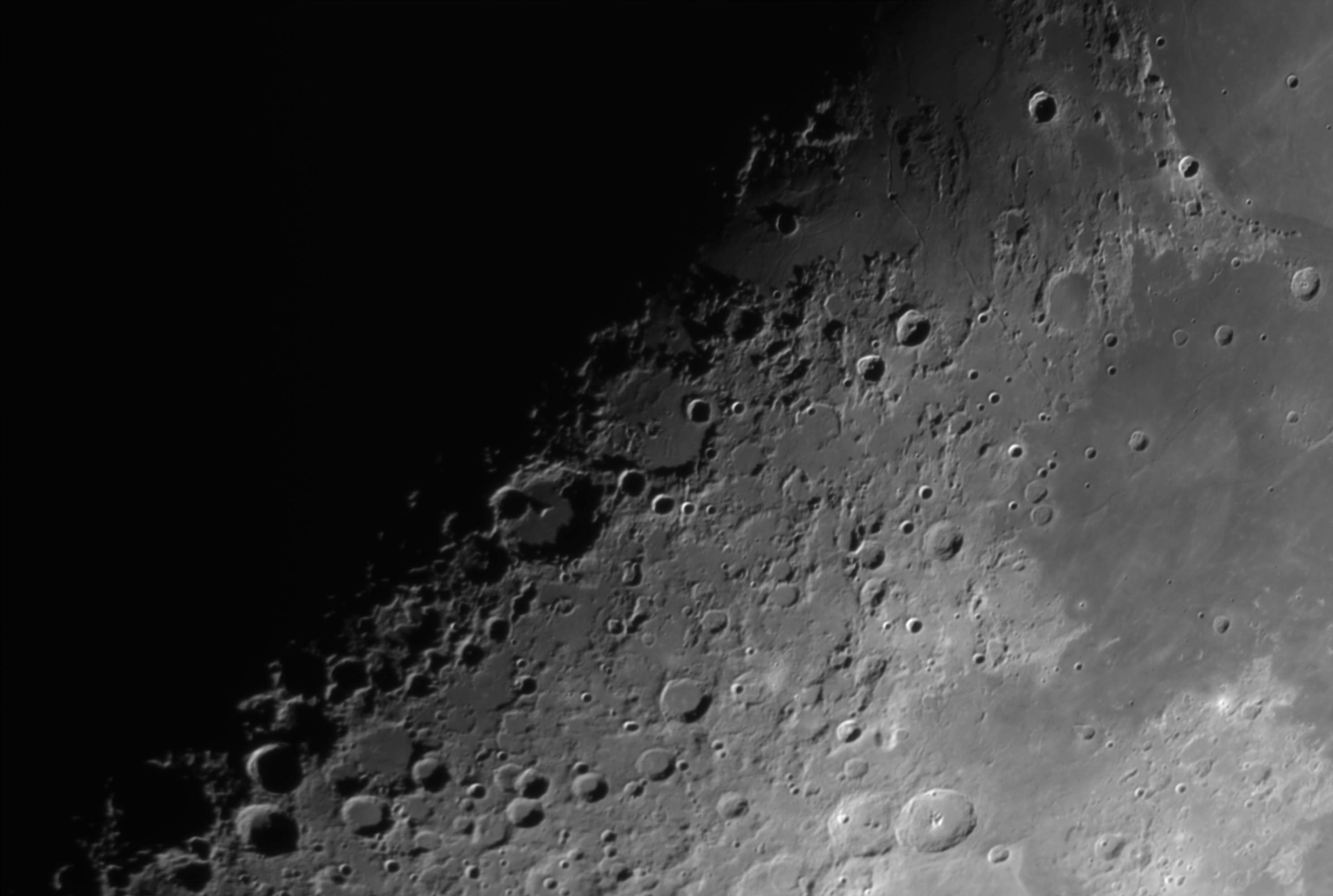 Image 1: The Lunar X & V stands out in high relief on the disk of the moon on October 28, 2025 at 7:11pm local time or 23 11m UT. The moon was at 43% phase and only 37 degrees above the horizon. Weather conditions were ideal with perfectly clear skies and good seeing conditions. The image was taken in daylight with sunset at 6:52pm local time. An Orion ED80T CF 480mm fl f/6 triplet apo carbon fiber refractor was tracking on an Orion EQ-2 mount. A ZWO ASI 178MM monochrome camera and Baader CMOS optimized UV-IR cut filter using Firecapture v2.7.15 acquired the video through the refractor. Computer utilized was an MSI GF65 gaming computer upgraded to 40GB of RAM. The SER video was processed using Autostakkert 4.0.13 and Registax 6.1.0.8. Further sharpening and processing in Photoshop CS4. Image by Gregory T. Shanos Longboat Key, (Sarasota), Florida.
