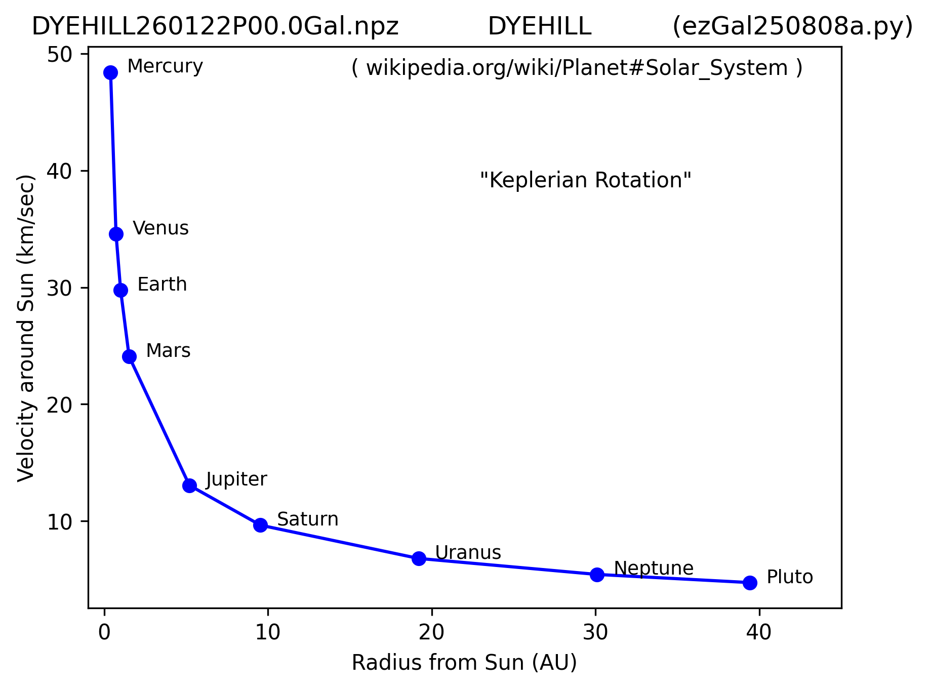 Next is an important graph of our solar system. Notice how the graph slopes downward as move away from the sun. As you move away from the sun, the velocity of the planets decrease.