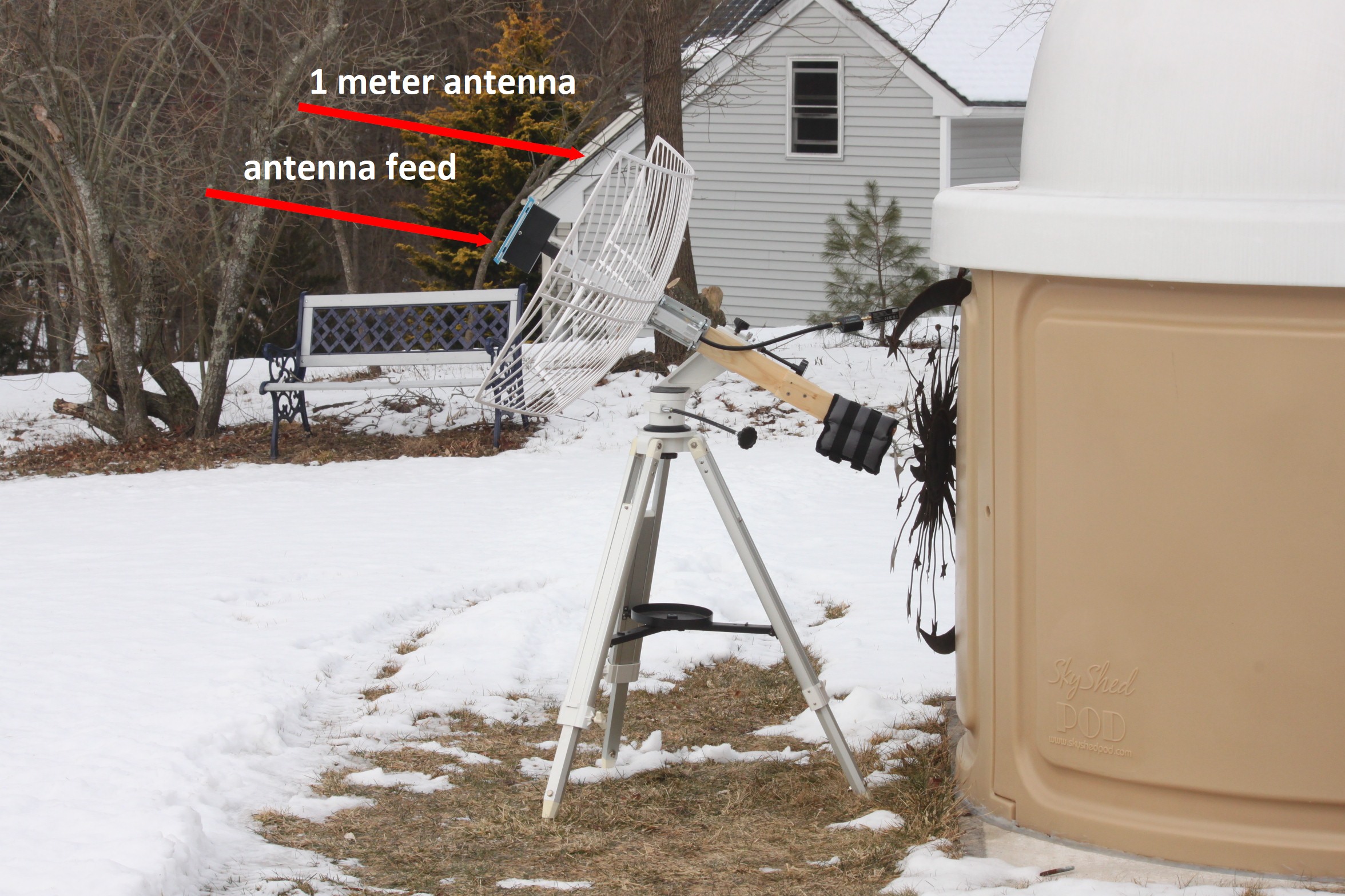 Below is a photo of the scope. A 1-meter radio telescope is considered small. It is common for advanced amateurs to have a 2-meter or 3-meter scope (10 feet in diameter). At the end of the coaxial cable is a low-noise amplifier, filter, and software-defined-radio, which allows connection to a mini PC inside the dome.